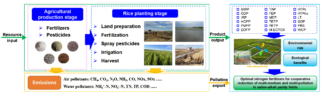 种植水稻是改良和利用盐碱地、提高边际土地利用率的有效措施之一。但随着大面积盐碱稻田的开发,因氮肥的不合理施用而造成的温室气体排放、地表和地下水污染、土壤养分失衡等环境问题也日益突出。现今氮肥种类众多,且其施用后对不同环境介质(气、水、土)及作物生长的影响存在异质性。因此,综合评估不同种类氮肥施用条件下盐碱稻田水稻生产过程的综合生态环境效应对于实现农业发展和环境保护协同具有重要意义。