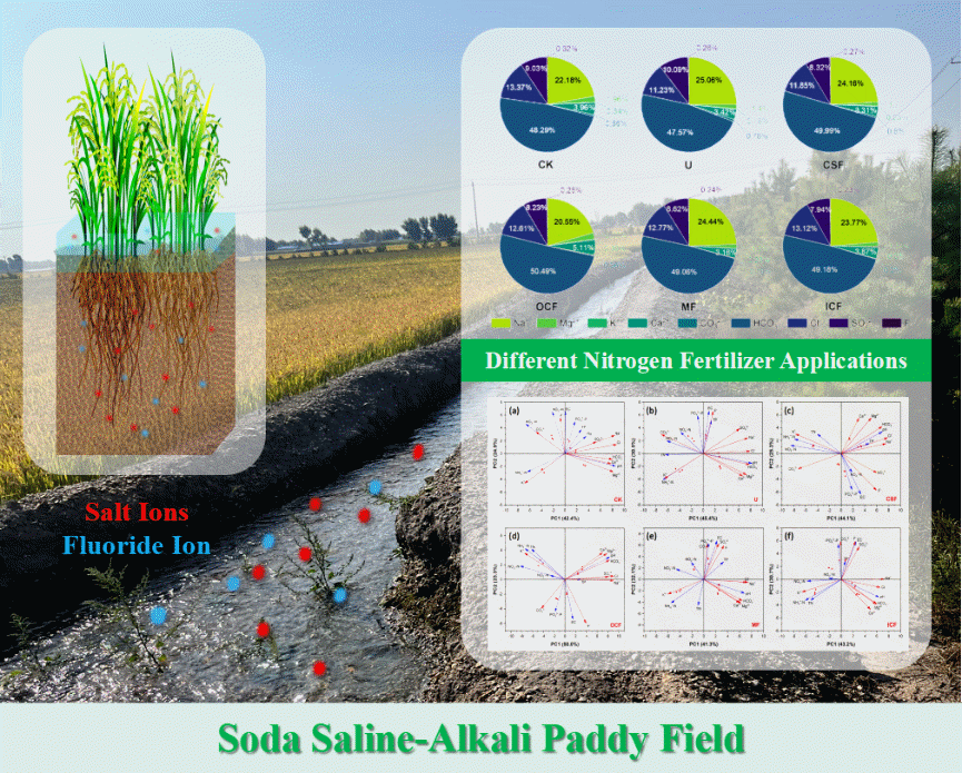 东北地理所水环境污染与防治研究团队通过田间试验,揭示了不同氮肥施用策略对离子输出的影响。研究表明,虽然水稻种植有助于改善苏打盐碱土壤,但同时也带来了离子径流排放的风险与挑战。在苏打盐碱稻田中,可溶性盐和氟离子的径流排放显著(p<0.001)受到氮肥种类、径流途径及其二者之间交互作用的影响。无论施用何种氮肥,钠离子和碳酸氢根均为苏打盐碱稻田主要发生径流排放的可溶性盐离子,分别占离子径流排放总量的20.55~25.06 %和47.57~50.49 %。与其他氮肥处理组相比,施用有机无机复合肥会显著(p<0.05)降低钠离子和碳酸氢根的径流排放,减少了碳酸氢根与氟离子之间的竞争吸附能力。同时,施用有机无机混施肥还降低了土壤中氟化钙的溶解能力,从而减少了氟离子径流排放。此外,无机复合肥可有效降低氟离子的径流排放。因此,建议通过优化氮肥种类,减少苏打盐碱稻田对生态环境的负面影响,推动农业生产的绿色转型和高效发展。