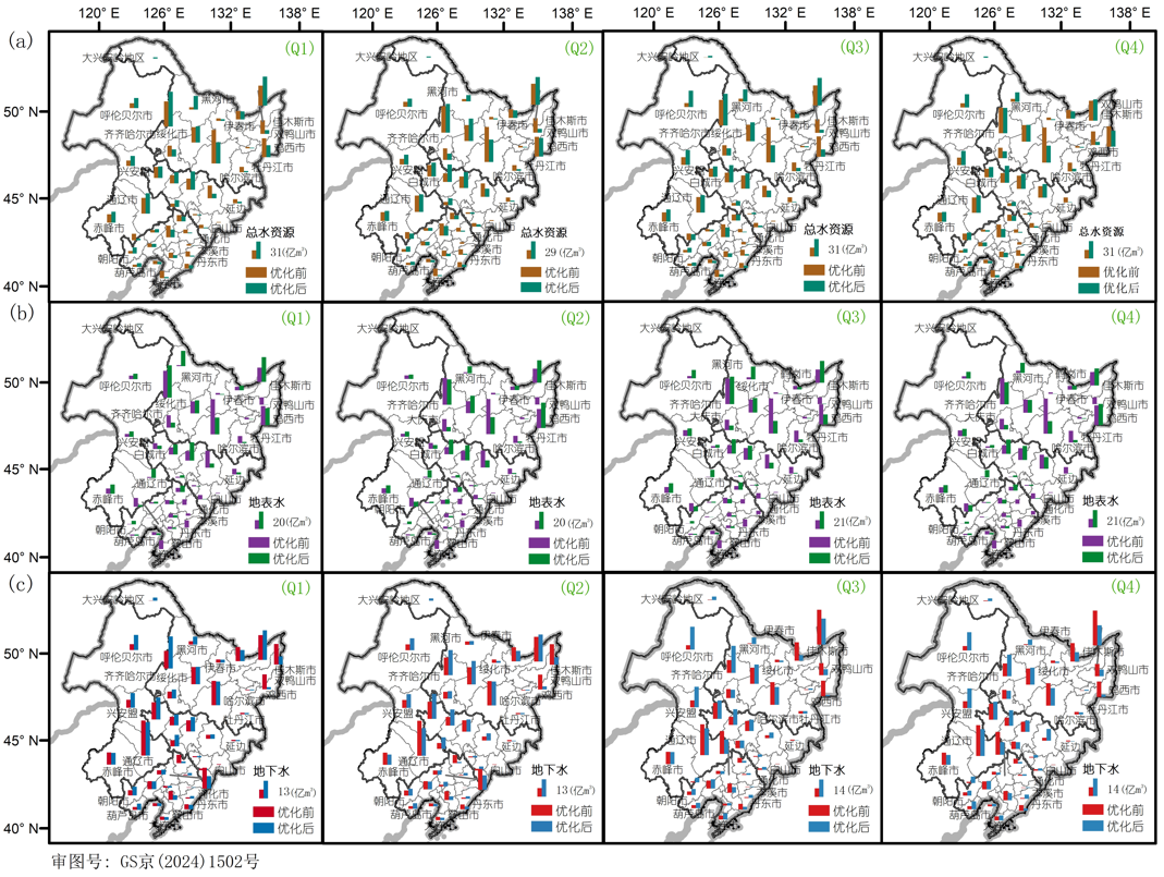 图2 优化前后东北黑土区水资源开发利用对比分析(a)总水资源量(b)地表水资源量(c)地下水资源量(Q1:平水年常规灌溉,Q2:平水年节水灌溉,Q3:枯水年常规灌溉,Q4:枯水年节水灌溉)