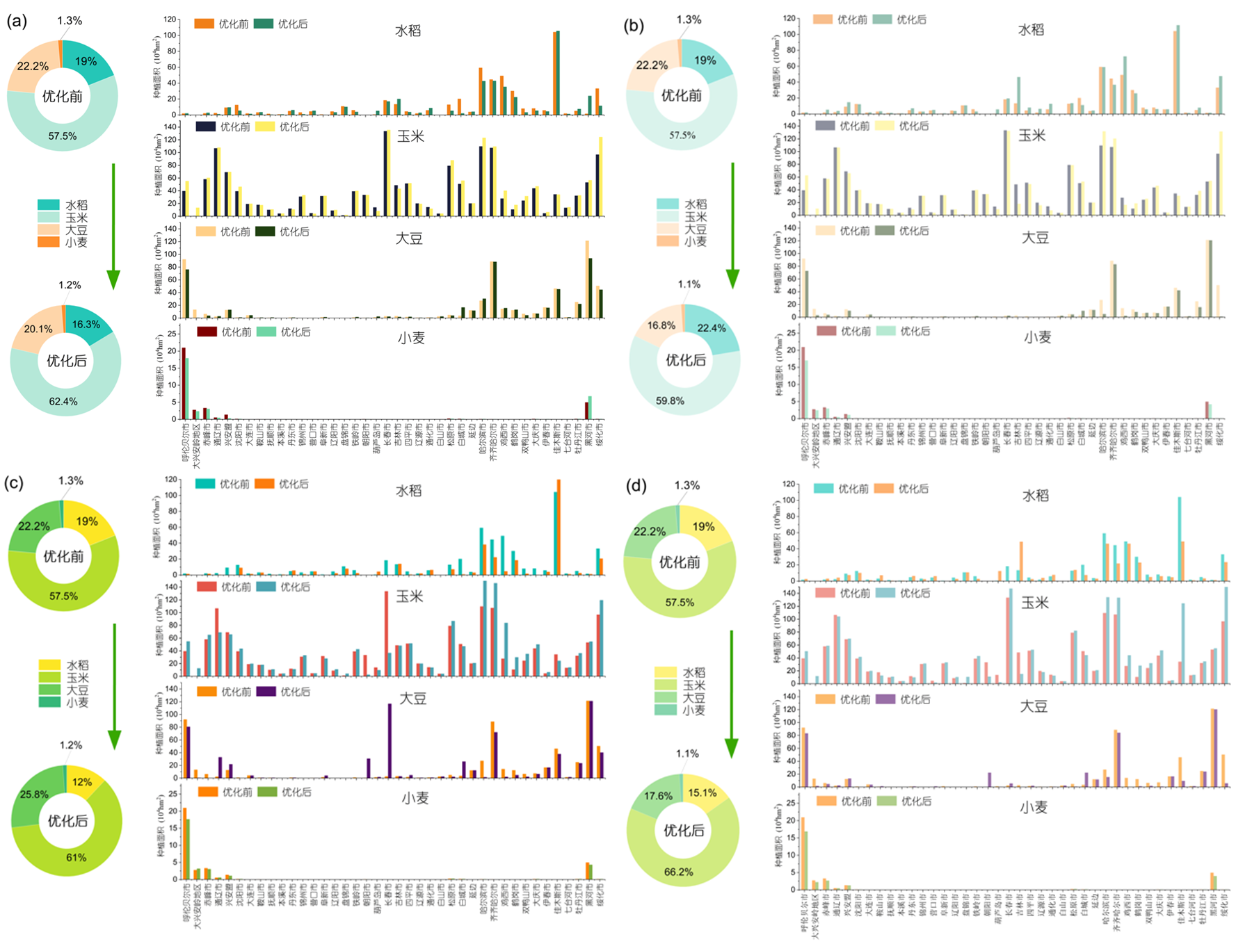 图3 优化前后东北黑土区作物种植结构对比分析(a)平水年常规灌溉情景(b)平水年节水灌溉情景(c)枯水年常规灌溉情景(d)枯水年节水灌溉情景