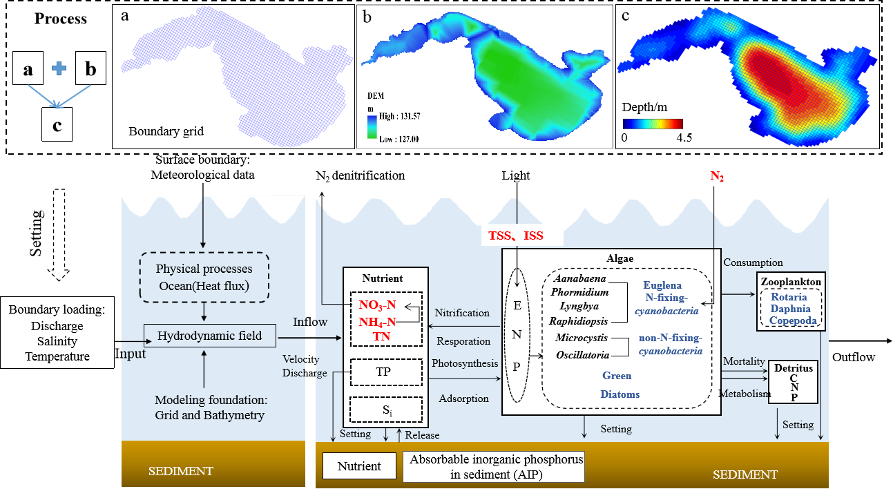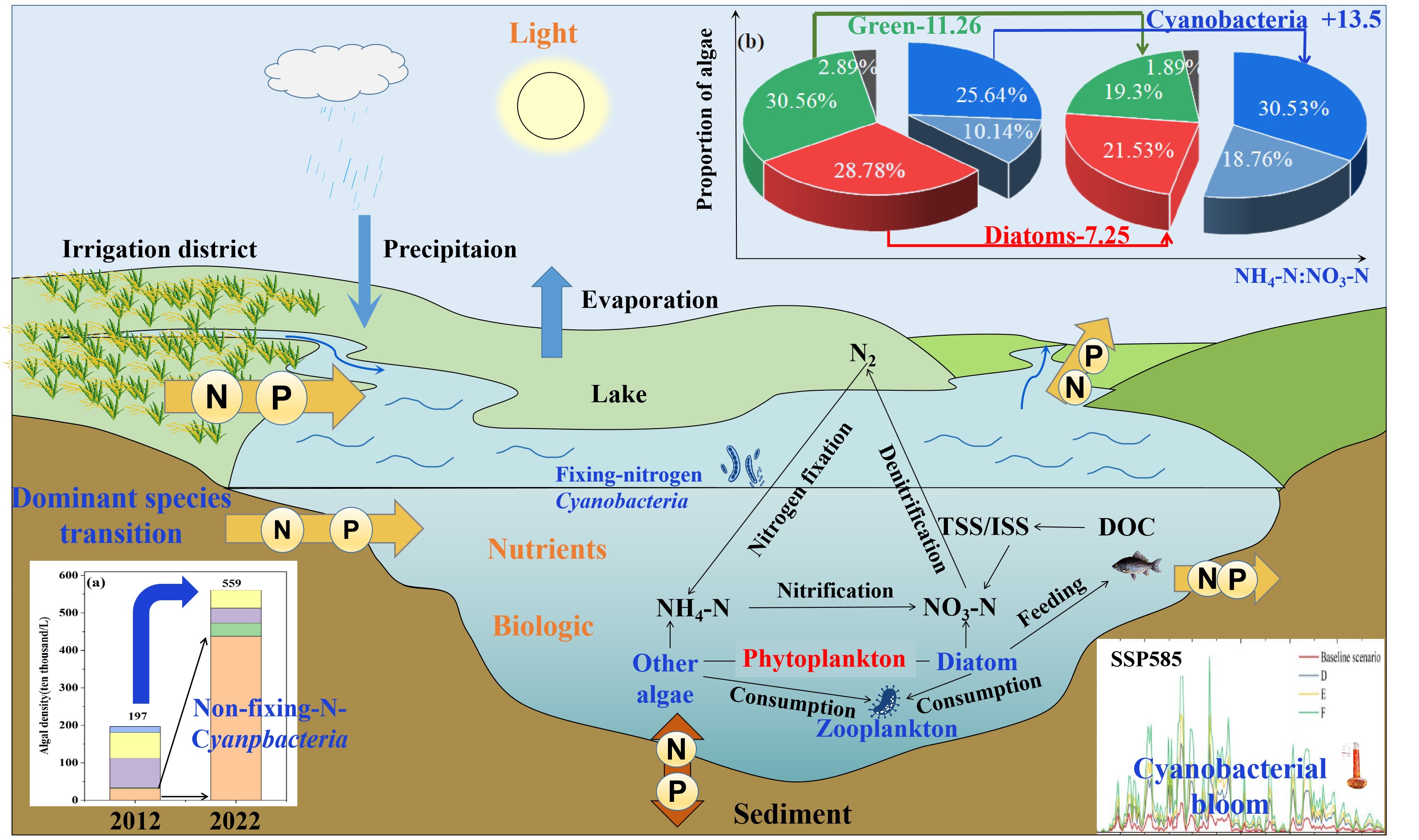 结果表明:2012-2022年,查干湖浮游植物优势种从硅藻转变为蓝藻(图1)。基于结构方程模型解析了这一演替的主要环境变量包括水温、总氮(TN)、总磷(TP)和氨氮(NH4-N)以及总悬浮颗粒物(TSS)。为了进一步探索浮游植物演替的驱动机制及其对气候变化的响应,我们构建了一个综合的水动力-水质-藻华综合模型来模拟多环境因子作用下各类型浮游植物生物量的演变(图2)。发现了营养物质的不同比例决定了浮游植物优势物种的演替。在浑浊水体中,高NH4-N:NO3-N比值有利于蓝藻生长,抑制硅藻生存。此外,硅藻(30.77%vs22.28%)和绿藻(30.56%vs23.30%)的生物量比例急剧下降。相比之下,随着NH4-N:NO3-N比值的增加,蓝藻丰度显著增加(35.78%-51.71%)。此外,当TN:TP≥20和NH4-N:NO3-N≥10时,非固氮蓝藻生物量占比高于固氮蓝藻。值得注意的是,在SSP585情景下,气温上升3.0℃时,蓝藻生物量达到基线情景的3-6倍。我们强调了氮形态对浮游植物优势种演替的影响,气候变暖将增强氮形态对优势种转变的驱动作用(图3),为控制蓝藻水华提供了科学依据。