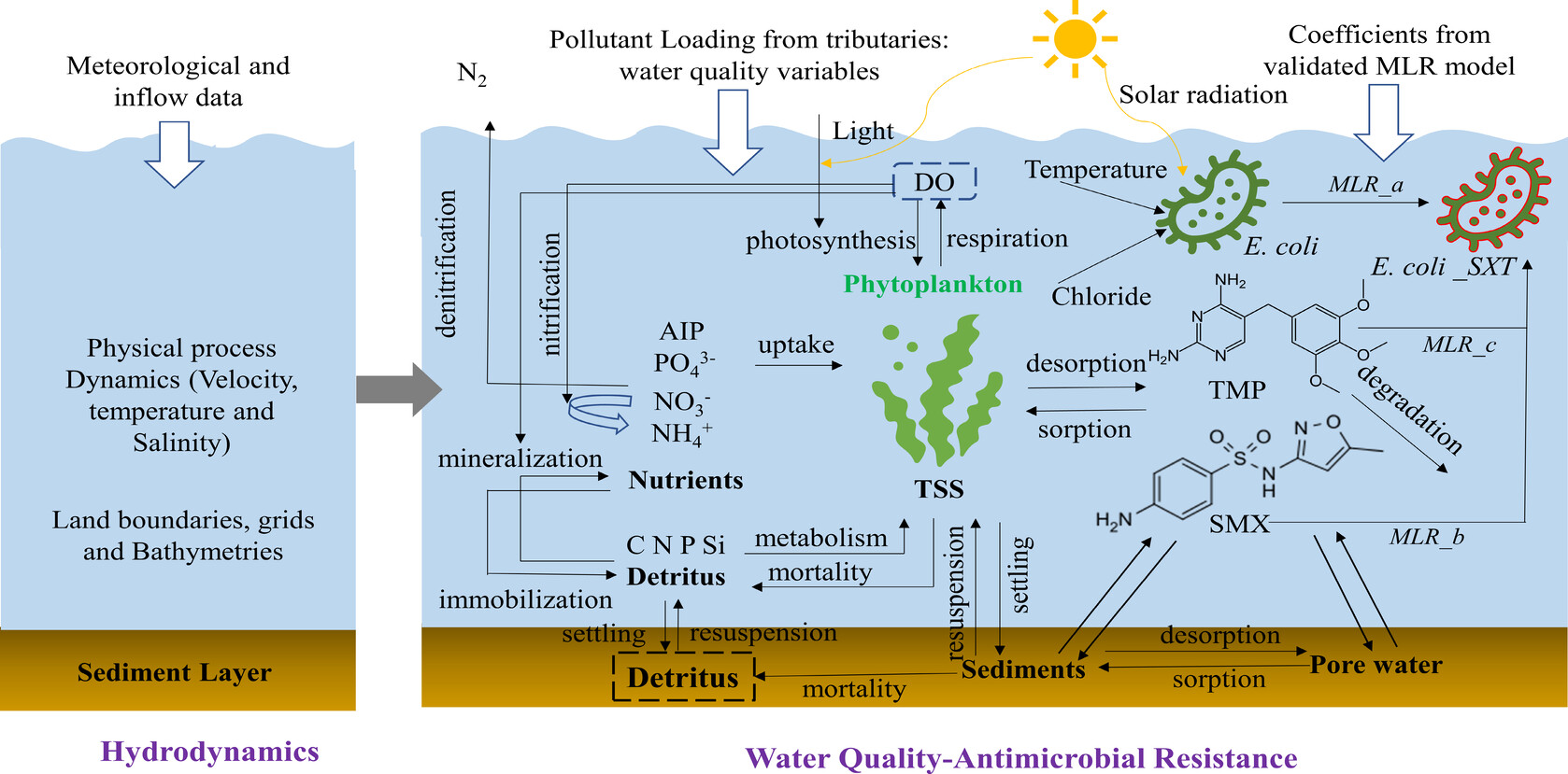 水生环境中微生物对抗生素的耐药性(AMR)日益增加,已被世界卫生组织列为人类面临的十大全球公共卫生威胁之一。因此,迫切需要建立和量化水生环境中抗生素和相关耐药性风险。中国科学院东北地理所张敬杰研究员参与并指导构建了综合建模框架,预测抗生素、大肠杆菌及其相关耐药菌株(ARB)的时空分布,用于识别AMR热点,评估抗生素在水生环境中的潜在环境风险。本研究对两种具有代表性的抗生素(SMX和TMP)、指示菌(大肠杆菌)及其相关的ARB(EC_SXT)进行了建模。风险评估表明,预测的TMP比SMX具有更高的AMR风险,但SMX具有更高的生态风险。该研究提出了一个混合建模框架,将统计模型与水动力水质模型结合起来,以整体的方式预测AMR,从而促进更好的风险管理发展。