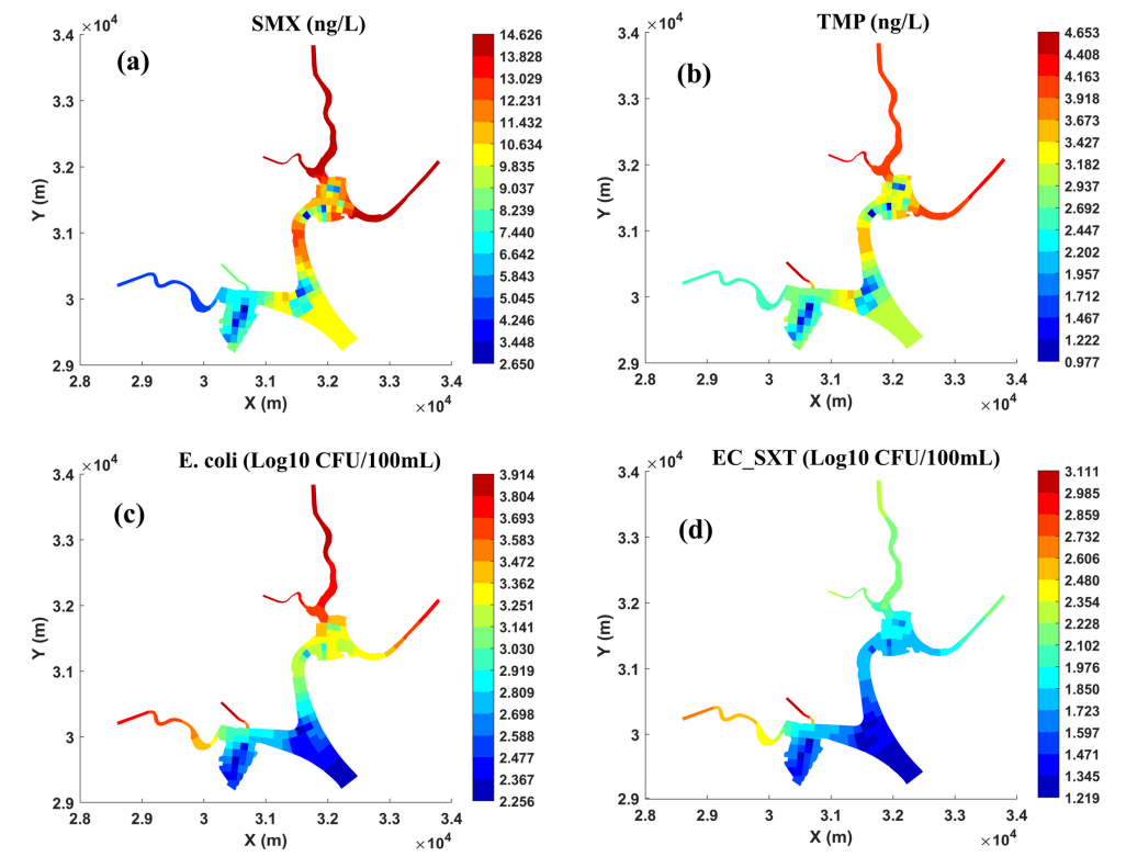 图4 模拟物质的空间分布:(a)SMX;(b)TMP;(c)E.coli;(d)EC_SXT,来自HWQ-AMR模型