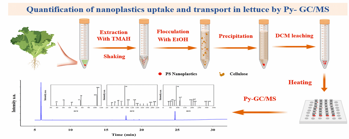 在日益严峻的环境污染挑战中,微塑料(MPs)与纳米塑料(NPs)作为新污染物,已广泛分布于自然环境中,威胁着陆地生态系统健康。环境中的NPs质量较低,难以精确检测,其环境风险评估一直面临技术瓶颈。东北地理所环境生态学科组研究团队通过优化提取程序和仪器的热裂解温度,成功开发出一种基于热裂解气相色谱质谱(Py-GC/MS)鉴定和定量植物中纳米塑料的方法,有效解决了这一问题[1]。该方法具有高度灵敏、操作简便的优点,并且避免了金属标记元素对植物的干扰。已成功将该方法应用于生菜对纳米塑料吸收情况的量化研究。