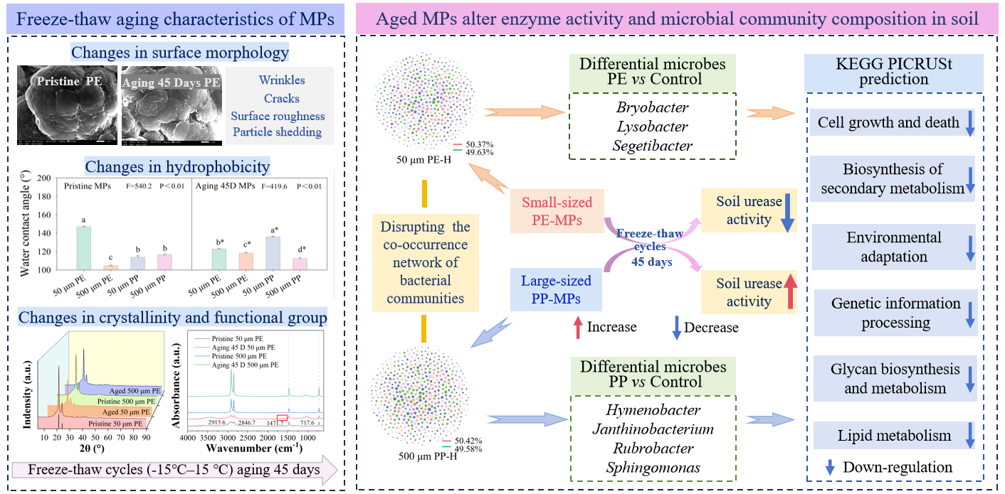 针对寒冷地区特有的冻融(FT)循环现象,该研究团队进一步探索了FT老化后的MPs对土壤酶活性和微生物群落结构的影响[4]。研究结果表明,FT老化后的MPs表面形貌和疏水性改变,结晶度降低。小粒径的MPs抑制了土壤脲酶的活性,而大粒径的MPs提高了土壤脲酶活性。FT老化的MPs显著改变了土壤微生物的群落结构,增加了细菌群落共现网络的复杂性。FT老化后的MPs还会影响遗传信息和细胞过程,并破坏次级代谢产物的生物合成。