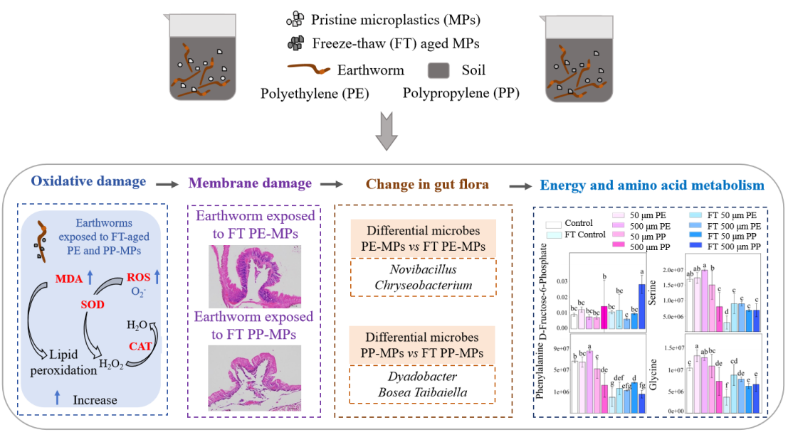 与此同时,该团队还揭示了FT老化的MPs对蚯蚓的毒性作用机制[5]。结果发现,FT老化的聚丙烯(PP)MPs比原始PP-MPs对蚯蚓造成更严重的氧化应激和膜损伤。FT老化的MPs会导致蚯蚓肠道菌群失衡并富集具有塑料降解能力的微生物属。与原始的聚乙烯(PE)MPs和PP-MPs相比,FT老化的PE-MPs通过上调脂质和类脂分子来影响膜转运,而FT老化的PP-MPs通过下调有机杂环化合物来改变外源物质的生物降解和代谢。