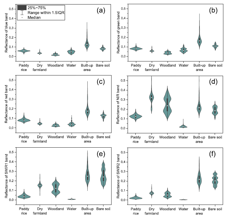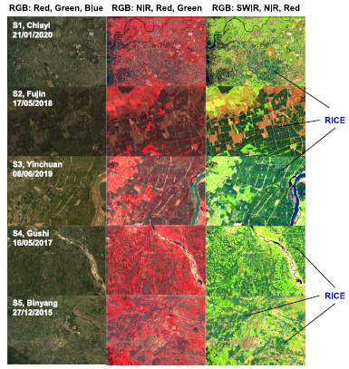 针对以上科学难题,中国科学院东北地理所李华朋副研究员带领团队,首次研发了一种全新的方法,命名为RiceTColour,旨在基于水稻在移栽期间的独特光谱特征开展水稻遥感制图。通过分析水稻和其他土地覆盖在可见光、近红外和短波红外波段的光谱分布特征,首次发现水稻在移栽期近红外和短波红外反射率值低于其他地物类型(除水体)的独特特征;进而,使用短波红外、近红外和红色波段组合,水稻田在遥感影像上呈现独特的颜色。