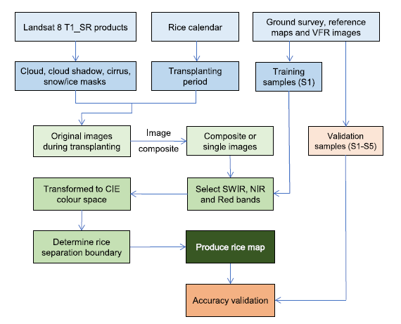 基于水稻该独特光谱特征,提出了一种全新的方法RiceTColour。该方法的主要思想是通过分析水稻及其他土地覆盖物的训练样本在CIE色彩空间中的空间分布模式,建立分类标准以区分水稻与其他土地覆盖类型。CIE色彩空间的最大优势在于,它能够将由传统三刺激值(RGB:红、绿和蓝)组成的任何颜色转换到量化的二维(2D)色彩空间,从而完成水稻分类边界的构建。