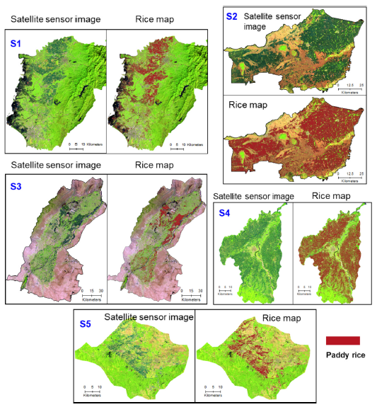 选择了我国五个典型的水稻种植区,在不同的环境条件下,全面测试所开发的RiceTColour水稻制图方法的有效性和普遍性。这些区域在气候、水稻种植强度、灌溉方式以及作物轮作等方面存在显著差异。实验结果表明,RiceTColour方法在所有五个地点相比基准方法始终取得了最准确和均衡的分类制图结果。RiceTColour在训练地点(S1)中表现相对稳定,整体制图准确率超过95%,在四个测试地点(S2至S5)中也取得了令人鼓舞的精度(>95%)。在各个水稻种植区域高效且稳定的水稻制图结果表明,所提出的无参数且高效的RiceTColour方法具有强大的推广能力。