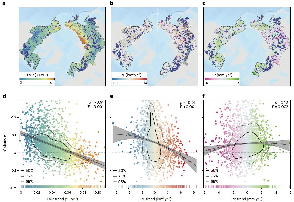 研究发现自2000年以来,北方森林的树种多样性(以香农多样性指数H'表示)平均增加了12%;树种多样性对气温升高表现出积极响应,但随着温度变化的加剧,这种关系逐渐减弱。在极端升温地区(温度增加超过0.065°C/年),树种多样性受到了负面影响。此外,该研究还发现,多样性的增加与北方森林生物量的生产力和时间稳定性的增加显著相关。这表明,气候变暖驱动的树种多样性增加对北方生态系统的功能具有积极影响,但在极端升温地区,这种趋势被逆转。本研究通过模型模拟量化了气候变化背景下树种多样性的时空演变及其对碳循环的影响,研究结果能够为制定区域性的气候适应策略提供重要的数据支持,并有助于预测和应对未来极端气候对森林生态系统的影响。