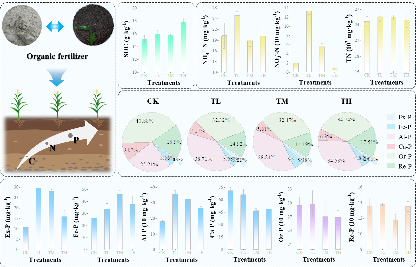 聚焦黑土有机培肥耕地质量保育与面源污染防控关键科学问题,东北地理所水环境污染与防治团队依托吉林省杏木国家水土保持科技示范园,基于10年有机-无机肥混施非控制野外试验研究(混施质量比:0%、30%、60%和100%),探明了化肥减量配施有机肥土壤中碳、氮、磷的积累效应,以及地表径流中氮、磷的输出特征与污染负荷。结果表明,化肥减量配施有机肥提高了土壤微团聚体的黏连效应及其对土壤有机质的物理保护作用。同时,化肥减量配施有机肥提高了土壤微生物的丰度和功能酶的活性,促进了矿物结合态氮、磷的溶解,以及有机态氮、磷的矿化。基于黑土培肥地力与污染防控相协同的目标,化肥减量30%配施有机肥是适于东北黑土区的最佳有机-无机肥配施比例。与对照组(有机肥配施比0%)相比较,该处理组土壤有机碳(SOC)、氨氮(NH4+-N)、硝氮(NO3--N)和速效磷(AP)的含量分别提高了18%、30%、570%和163%,地表径流中总磷(TP)浓度降低了55%。但是,化肥减量配施有机肥在一定程度上提高了地表径流中总氮(TN)的浓度,特别是化肥减量60%条件下,需重点关注氮素随地表径流流失的风险。