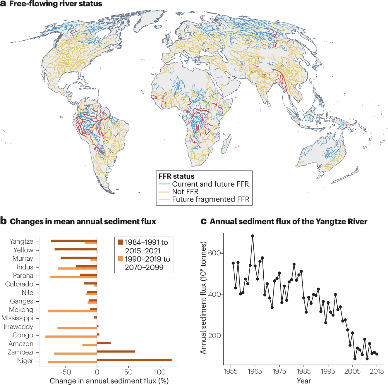 图4 全球长度超过500km的河流的自由流动状态以及各大型河流河口泥沙通量的变化