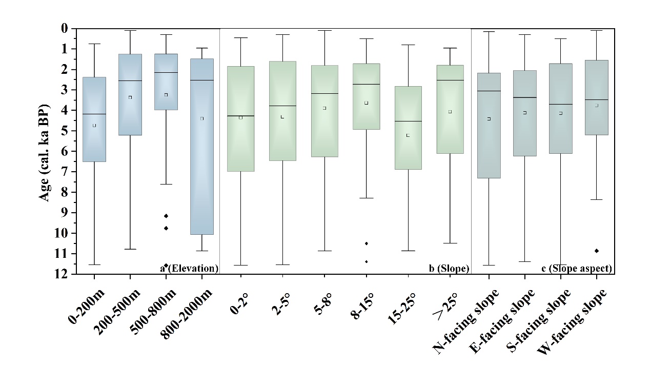 图1 全新世东北地区泥炭沼泽在不同海拔、坡度和坡向地形下形成时间