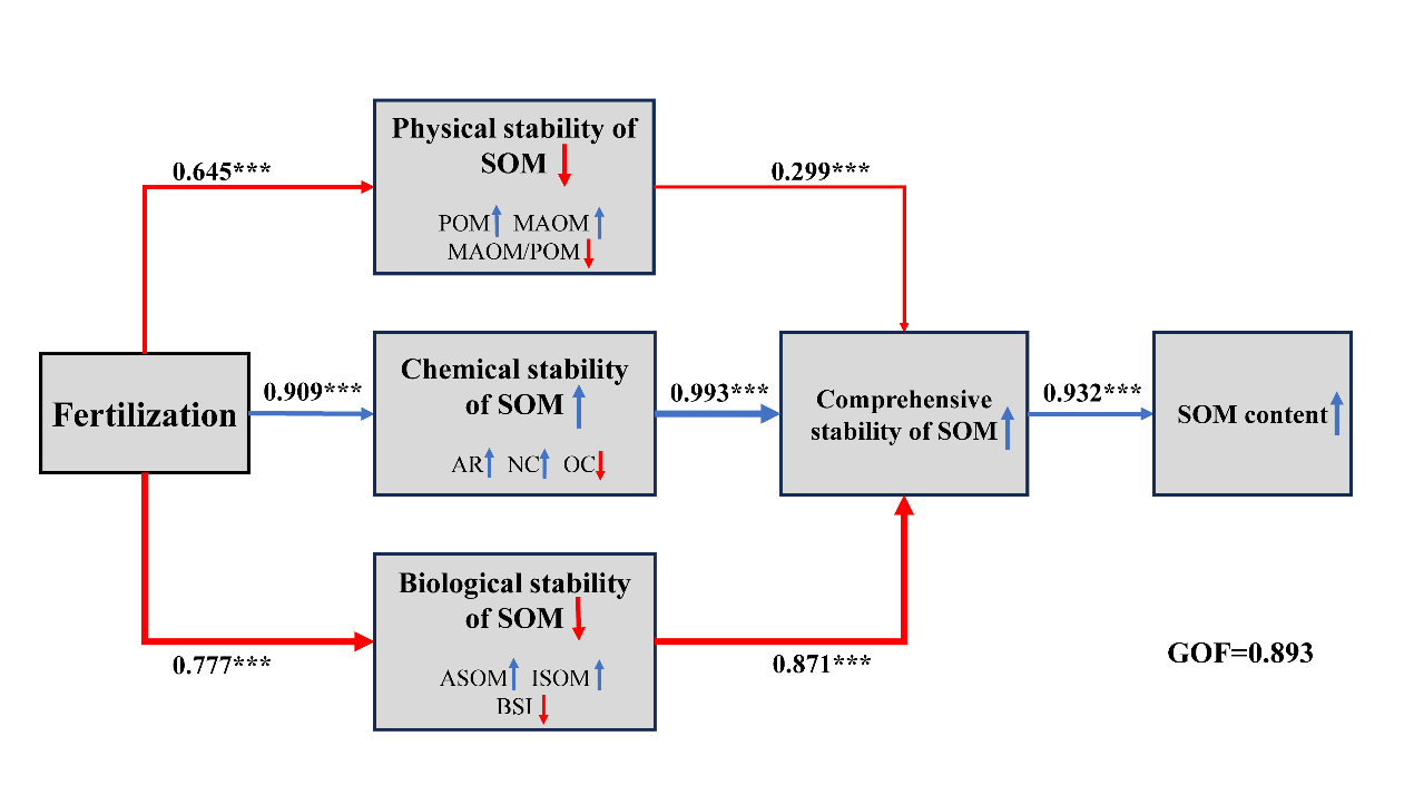 研究发现,与不施肥相比,施肥措施主要促进了具有较高活性的POM含量的增加,其中有机物料的施用效果显著优于单一施用化肥,但施肥后降低了MAOM/POM,进而降低了SOM的物理稳定性。另外,长期施肥显著增加了SOM中的芳香化合物、含氮化合物和含硅化合物等稳定成分的含量,提高了SOM的化学稳定性。而针对SOM的生物稳定性,施肥主要促进了SOM中可矿化有机质(ASOM)的形成,提高了SOM的矿化速率常数,降低了SOM的BSI,从而降低了SOM的生物稳定性(图1)。不同施肥措施主要通过提高SOM的化学稳定性而提高了SOM的综合稳定性,而SOM稳定性的变化直接影响了SOM的含量(图2、图3)。研究结果证明,施肥可以提高SOM的综合稳定性,且化肥配施秸秆和化肥配施有机肥的效果明显优于单施化肥。本研究为长期不同施肥管理下SOM稳定性变化及其固存机制提供了科学依据。