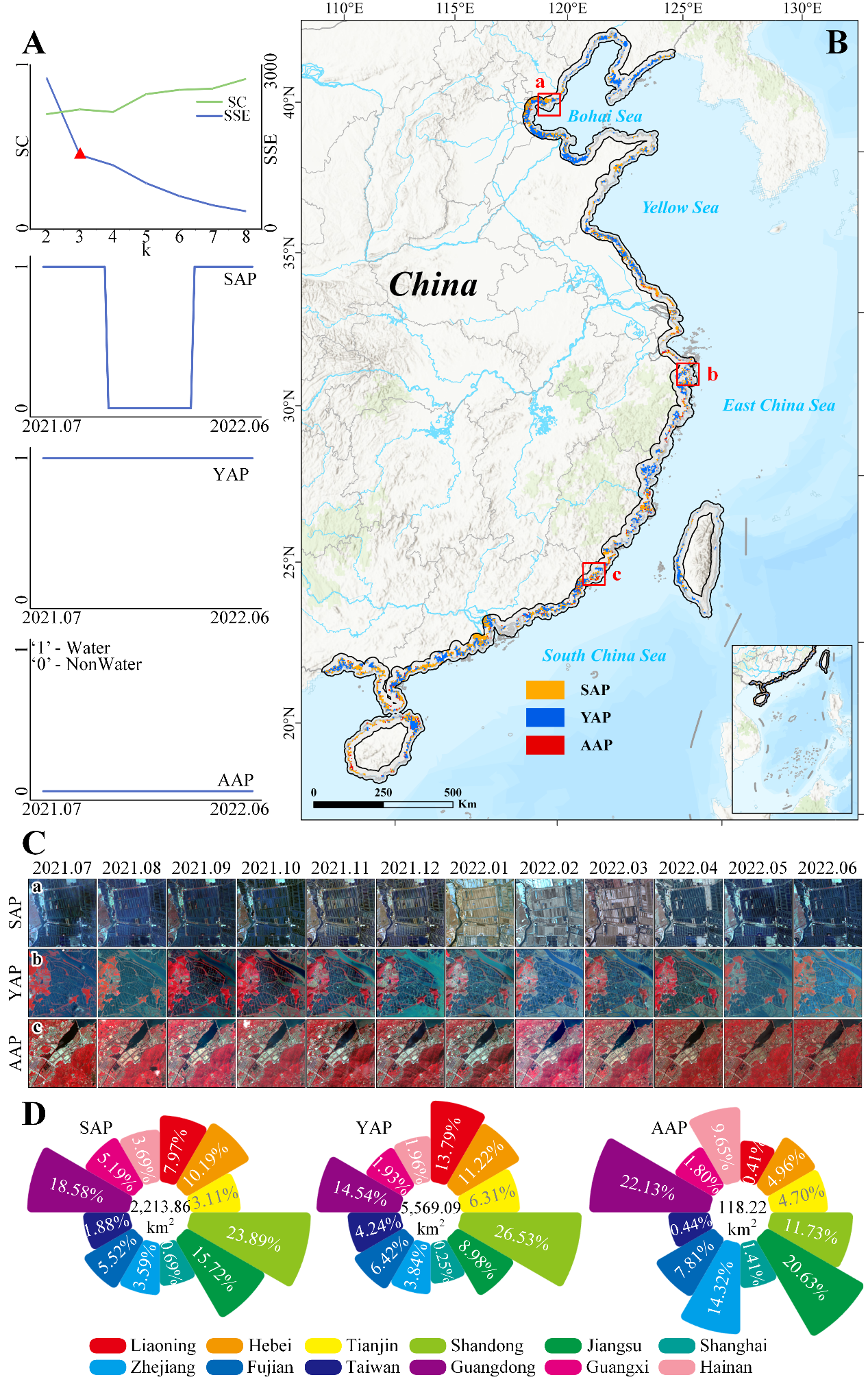 水产养殖业是最具潜力的粮食生产产业之一,在解决全球粮食安全和营养问题以及促进地区发展和增加就业等方面发挥着重要作用。自1980s开始,中国滨海养殖池分布快速扩张,导致了一系列严峻的生态和环境问题,例如生境破坏、水体富营养化、生态系统退化等。为了实现滨海地区社会经济和环境保护的协同发展,需要对滨海养殖池的时空分布和排蓄水动态进行系统监测。