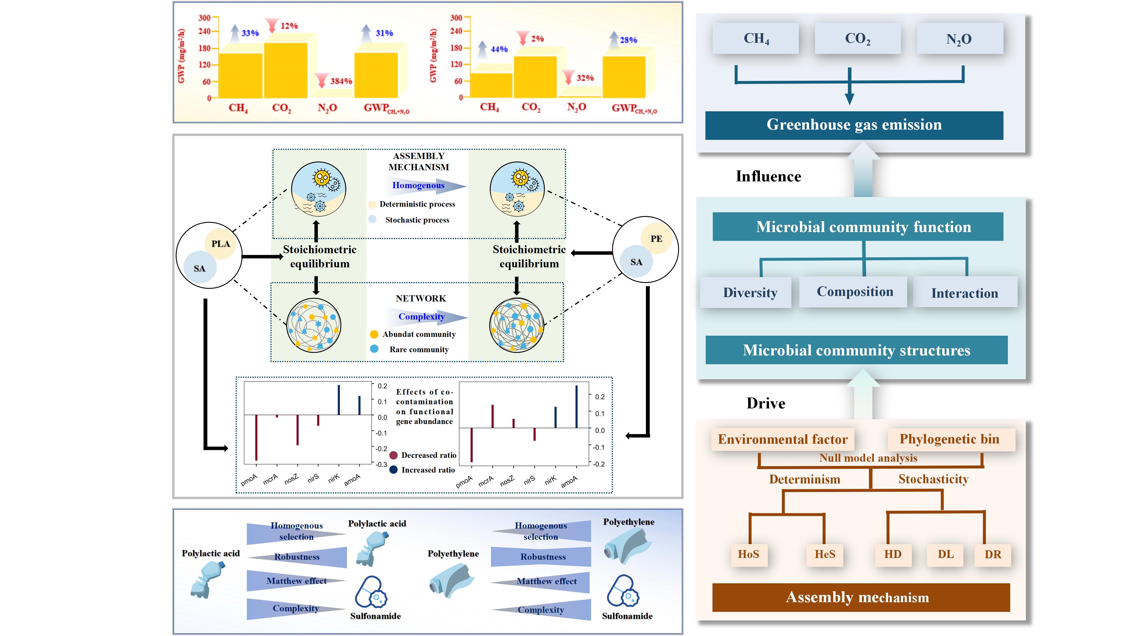 农田排水沟渠既是农业径流的汇,又是邻近下游水体的源,其沉积物在有机质矿化和碳氮生物地球化学循环中起着关键作用,被认为是温室气体排放的热点区域。此外,由于农业生产中农用塑料产品和抗生素类药物的广泛使用,部分污染物可能会随着地表径流排入农田沟渠,因此除了接收碳氮等污染物以外,农田排水沟渠沉积物还是微塑料和抗生素的潜在富集区。然而,在多种污染物联合作用下,农业沟渠沉积物的温室气体排放规律及其潜在微生物机制尚不明确。