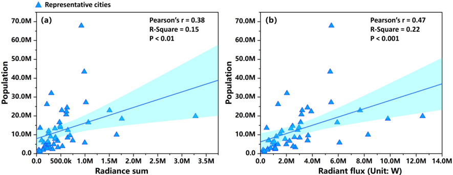 本研究通过辐亮度、辐射通量分别与人口进行拟合来说明采用辐射通量的优势。图3展示了全部50座城市的拟合结果,图4则分别对北美、欧洲以及东亚三个地区的城市进行了拟合分析。结果表明,辐射通量显著提升了夜间灯光遥感数据对人口等社会经济参数进行估算的能力。