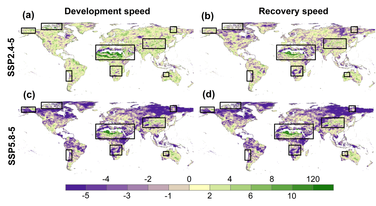 图3. 与历史多模型集成均值比较,SSP245和SSP585情景下干旱瞬时发展和恢复速度的相对变化(%)。正值表示干旱发展或恢复过程的加速,反之亦然。