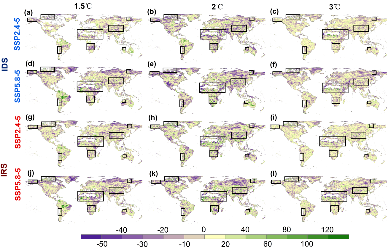 随着全球变暖加剧(1.5°C、2°C和3°C),IDS和IRS较快的区域将扩大,低IRS区域将缩小,但IDS较慢的区域也会增加。在SSP245和SSP585情景下,八个历史时期的热点地区在未来不同升温水平下仍将持续存在,但变化趋势各异(图4)。