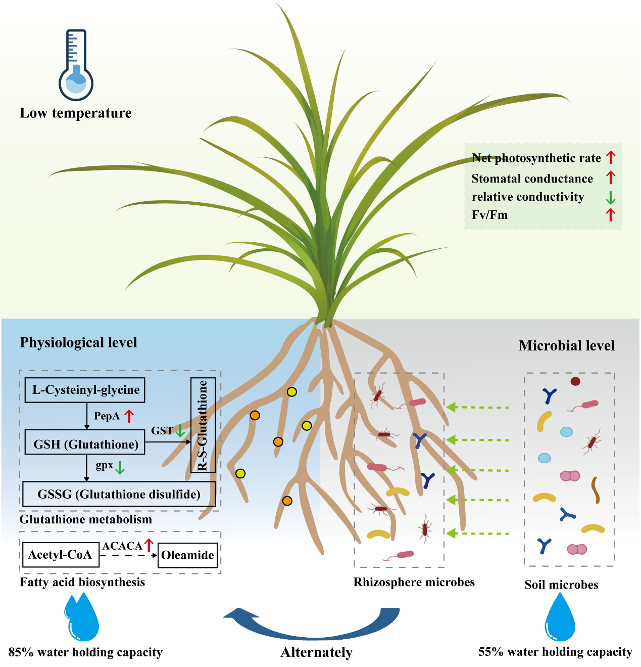 低温导致作物植株细胞膜通透性改变、限制光合碳同化能力,对作物生产造成极大影响。根际微生物通过代谢调节、细菌细胞外多糖产生、抗氧化防御和促进根系生长等方式帮助作物应对环境胁迫。分根区干旱灌溉已被广泛用于调节作物根系发育和缓解环境胁迫,但现有的研究主要关注干旱和盐胁迫下作物的生理机制,对灌溉诱导的根系代谢和根际微生物组的改变如何促进低温抗性的见解有限。