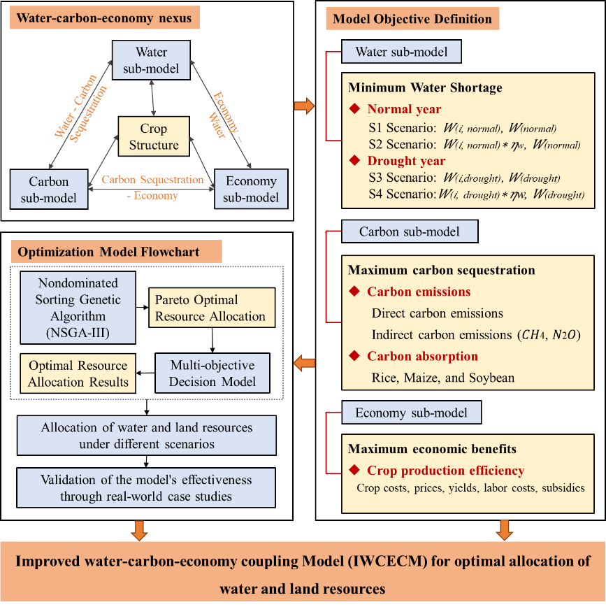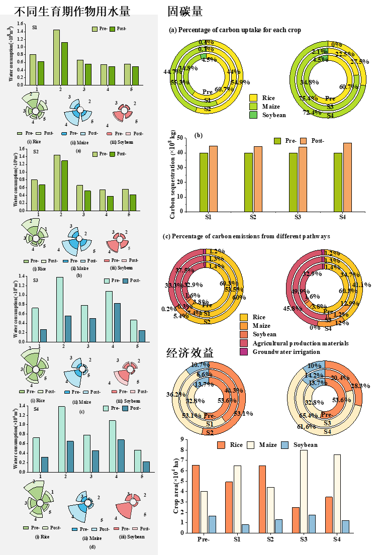 本研究突破了以往水资源分配中对作物需水过程过度概化的问题,并对我们之前研发的WCECM模型进行了改进。研究从作物灌溉用水、种植结构、固碳量、经济效益和产量等多个角度进行了深入分析。基于作物需水过程,提出了不同水文情景下的作物种植结构和水资源优化配置方案。通过 NSGA-III 算法选择最优解,并提出有针对性的优化策略。最后将改进的水-碳-经济耦合模型(IWCECM)在中国具有代表性的农业主产区——三江平原友谊农场进行应用和验证。结果表明,改进后的模型不仅能够根据不同情景精确调整作物种植结构,管理每种作物在不同生长阶段的灌溉用水需求,还能提高固碳量、经济收入和粮食产量。具体而言,优化后,平水年常规灌溉模式 (S1) 和节水灌溉模式 (S2)以及干旱年份的常规灌溉模式 (S3) 和节水灌溉模式 (S4)下的种植面积比例分别为4:5:1、5:4:1、2:7:1和3:6:1。与优化前相比,四种方案的总固碳量分别增加了4.95×108 kg、4.56×108 kg、4.04×108 kg和6.84×108 kg,粮食总产量分别增加了1.72×108 kg、1.43×108 kg、0.69×108 kg和1.45×108 kg。除枯水年外,其他方案下的经济效益与优化前无明显差异。在平水年,作物在生长初期的总用水量最高;在枯水年,作物在生长中期的总用水量最高。该结果不仅对解决当前农业水资源和土地资源的相关挑战具有现实意义,也为未来农业的可持续发展提供了参考和建议。