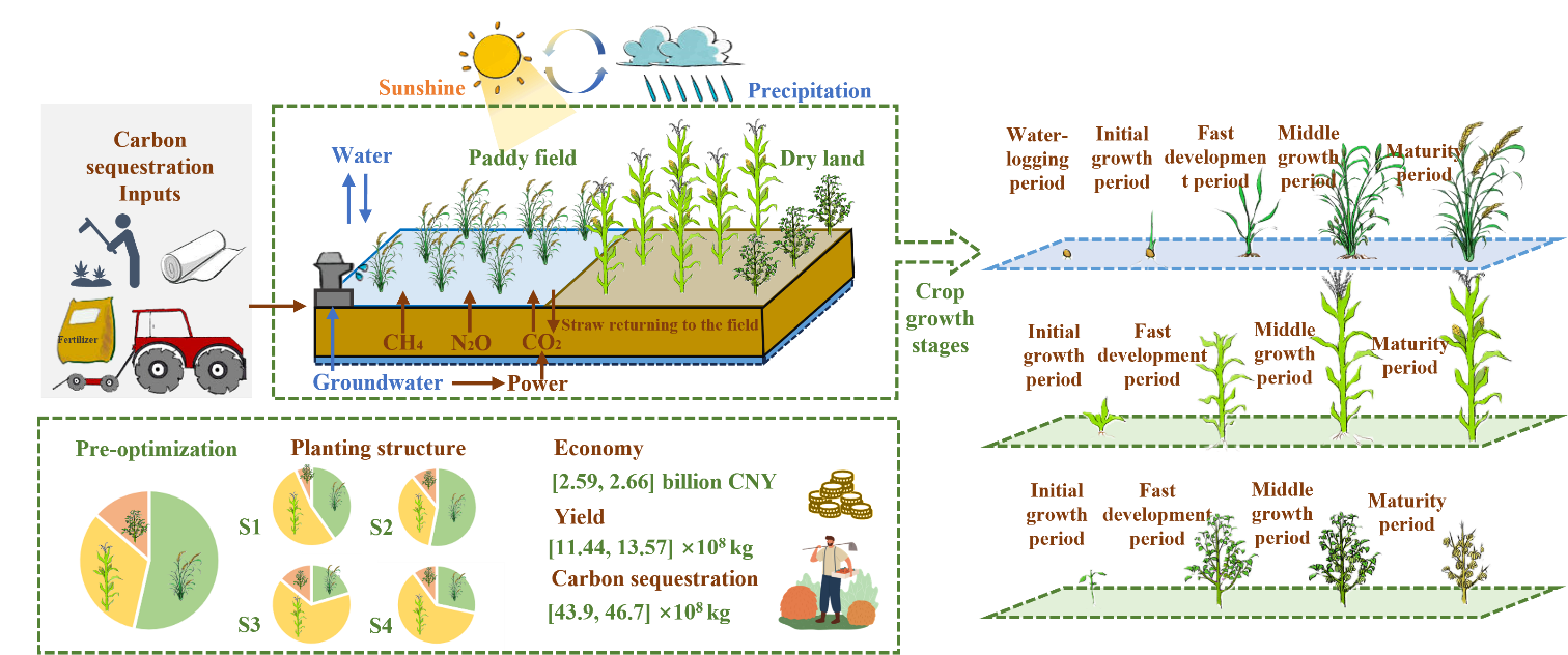 农业灌溉占用全球取用水总量的70%以上。在国家“四水四定”的战略背景下,解决水土资源时空不匹配的问题对保障我国粮食安全至关重要。水土资源之间联系错综复杂,任何一种资源的短缺都会限制另一种资源的利用,从而降低水土资源的综合利用效率。在开展农业水土资源优化配置研究时,如何协调二者之间关系是亟需解决的关键科学问题。然而,由于极端气候频率不断增加和下垫面条件复杂性加剧,水资源年际间和年内变异系数显著增强,充分满足农作物生长过程的水资源可持续供给面临着巨大的挑战。特别是在干旱时期,降水量的减少使得可供作物生长的有效降水量大幅下降,从而加剧了农业生产用水的压力。同时,农业生产过程中过量施用化肥、农药和农业机械会导致大量碳排放,对生态系统的稳定构成威胁。因此,从水-碳-粮食耦合视角开展基于作物需水过程的农业水土资源优化配置研究对保障我国粮食安全具有重要意义。
