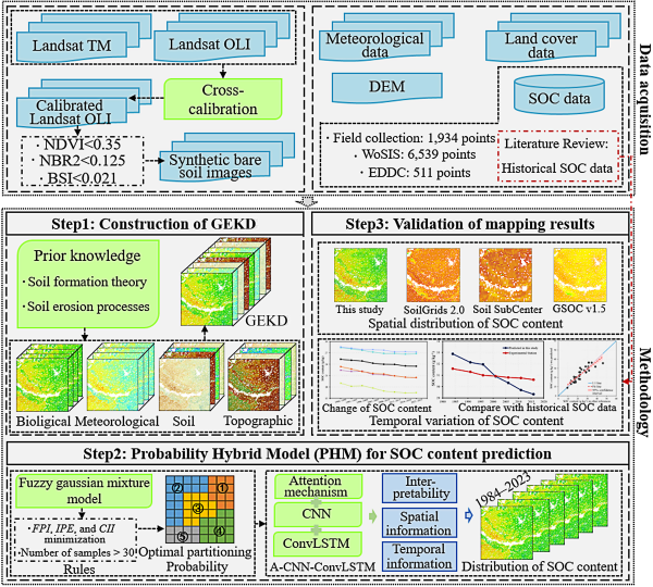 为了应对这些挑战,中国科学院东北地理与农业生态研究所农业遥感学科组研究人员收集了8984个土壤样本、956423张Landsat TM/OLI遥感影像、数字高程模型和气象数据,开发了一个考虑土壤形成与侵蚀过程的地理知识数据集(GEKD)。该数据集被输入概率混合模型(PHM)进行区域划分,并进一步结合注意力机制、卷积神经网络与长短期记忆网络(A-CNN-ConvLSTM)构建高精度SOC预测模型。