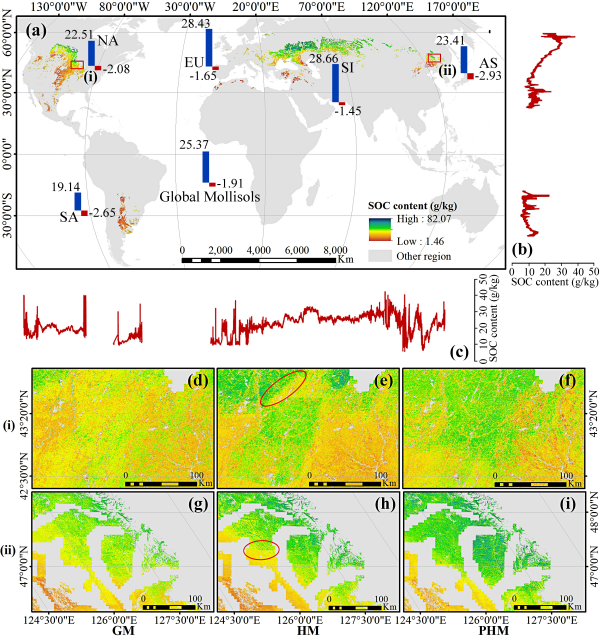 研究结果显示,结合GEKD和A-CNN-ConvLSTM算法,SOC含量预测精度达到RMSE = 7.17 g/kg、R² = 0.72、RPIQ = 1.92,优于传统模型。此外,PHM模型有效降低了SOC空间异质性带来的误差,使预测结果更加平滑、稳定。与全球模型相比,PHM将RMSE降低1.66 g/kg,R²和RPIQ分别提高0.06和0.15。研究生成了自1984年以来全球黑土区30m分辨率的SOC空间图,并揭示了SOC含量下降的整体趋势。其中,全球黑土区SOC平均下降1.91 g/kg,亚洲黑土区降幅最大(2.93 g/kg),西伯利亚黑土区降幅最小(1.45 g/kg)。该研究不仅为全球黑土区SOC动态监测提供了新技术手段,还为黑土区碳汇管理和农业可持续发展提供了科学支撑。