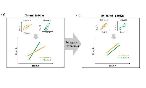 图1 来自不同生境的木本植物在自然环境中呈现相异的功能性状权衡关系,该关系在移栽入植物园数十年后逐渐呈现为趋同性(© 2025 Wiley Ltd.)