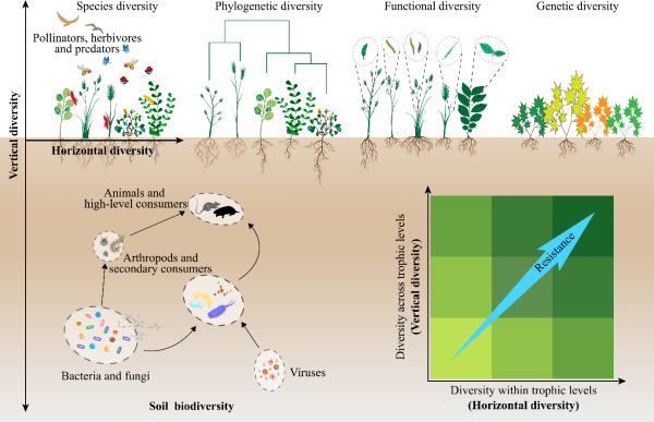 水平方向的多样性(包括物种多样性、谱系多样性、功能多样性、遗传多样性)增加群落入侵抵抗力的机制是多样的本地物种对资源的利用率更高、或者更可能包含对外来植物有强抵抗力的物种。如果入侵植物对互利者的依赖降低,多样的互利者也可通过促进本地植物的生长增强入侵抵抗力。不同营养级的物种(垂直方向多样性),如寄生生物、草食者、互利者、捕食者等可以通过与植物的互作影响入侵抵抗力。已有少量研究表明捕食者可以压制取食本地植物的昆虫,从而降低入侵植物通过天敌逃避获得的优势并增强群落入侵抵抗力。微生物的存在可以增强本地植物多样性和入侵抵抗力间的正相关关系。理论模型表明物种接近饱和、种间互作更复杂的群落表现出更强的入侵抵抗力。这些表明增加营养级的数量将增加本地群落的入侵抵抗力。