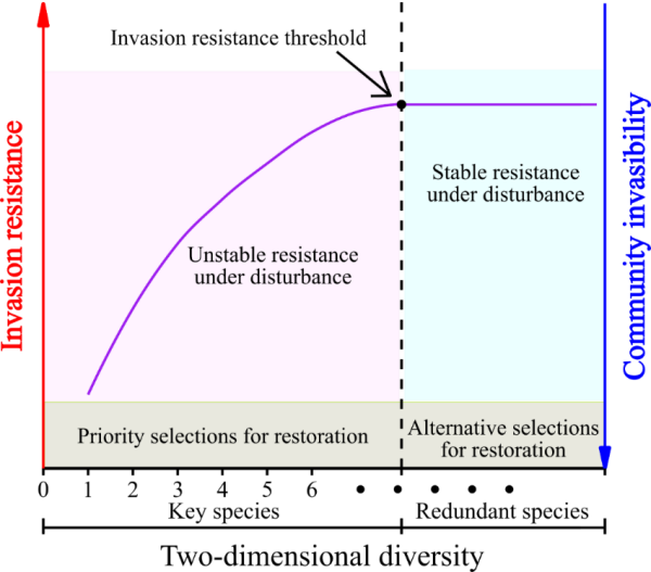 图2 两维度多样性对本地群落入侵抵抗力的可能作用。当本地群落达到入侵抵抗力阈值后,继续增加两维度多样性不会增加入侵抵抗力。在达到这个阈值前,系统的入侵抵抗力在干扰下不稳定,并且重要物种的丧失会降低入侵抵抗力