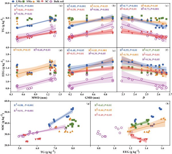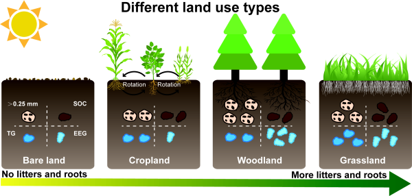 东北地理所黑土保护与利用学科组研究人员以1985年在东北黑土区建立的四种不同土地利用类型(裸地、农田、草地和林地)为研究对象,利用团聚体分级的方法探讨了不同团聚体粒径中SOC、全氮(TN)以及GRSP(总球囊霉素TG和易提取球囊霉素EEG)的含量变化。研究结果表明,草地和林地生态系统的大团聚体比例、SOC、TN和GRSP含量均显著高于农田和裸地。TG在原土和大团聚体中的含量与土壤有机碳呈显著正相关,而EEG在较小团聚体粒径中发挥了更重要的作用。球囊霉素组分在不同团聚体尺寸中对土壤有机碳积累的差异性影响,突显了SOC动态的复杂性以及考虑团聚体尺度过程的重要性。此外,我们观察到GRSP组分与土壤团聚体稳定性之间存在显著正相关关系。这些发现强调了GRSP作为一种持久性结合剂的关键作用,它积极参与土壤团聚体的形成和稳定,从而间接增强了土壤有机碳的保护和持久性。总体而言,本研究揭示了土地利用方式、土壤团聚体、GRSP和SOC之间的复杂关系。研究结果强调了保护和恢复自然植被覆盖(如草地和林地)对于促进土壤有机碳固存和缓解气候变化的关键重要性。