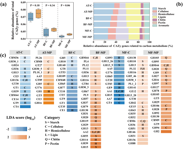 结果表明,PE微塑料对长白山不同海拔带土壤养分的影响存在显著差异,但均导致土壤pH值升高。在低海拔地区(MF),微塑料显著提升了土壤溶解有机质(DOM)的腐殖化程度和细菌群落的α多样性,而对中、高海拔(BF和AT)区域的类似效应较弱。此外,微塑料促进了中、低海拔(BF和MF)区域土壤中碳水化合物活性酶(CAZy)功能基因的富集,表明其对微塑料对不同海拔土壤碳代谢途径存在差异化调控。