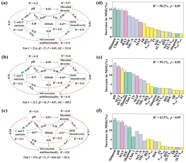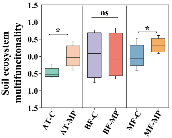 研究发现,微塑料对不同海拔带土壤生态系统多功能性具有差异性影响。进一步分析表明,土壤细菌多样性、pH值、有机碳、DOM化学多样性及年平均温度等因子共同构成土壤生态系统多功能性的核心驱动网络。