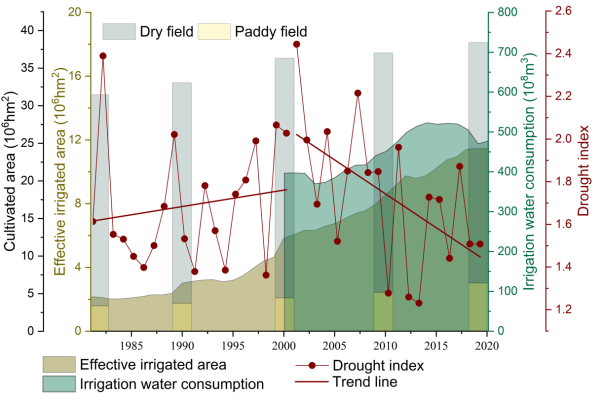 图1 东北黑土区耕地面积(1981-2020年)、有效灌溉面积(1981-2020年)、灌溉用水量(2000-2020年)和干旱指数(1981-2020年)