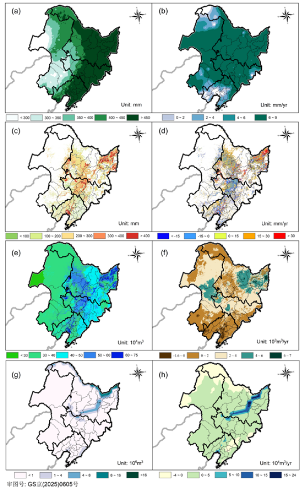 图2 东北黑土区蓝绿水资源演变特征 (a) 不同生育期有效降雨量;(b) 有效降雨量变化率;(c) 作物实际蒸发量;(d) 作物实际蒸发量变化率;(e) 农业绿水资源量;(f) 农业绿水资源量变化率;(g) 农业蓝水资源量;(h) 农业蓝水资源量变化率