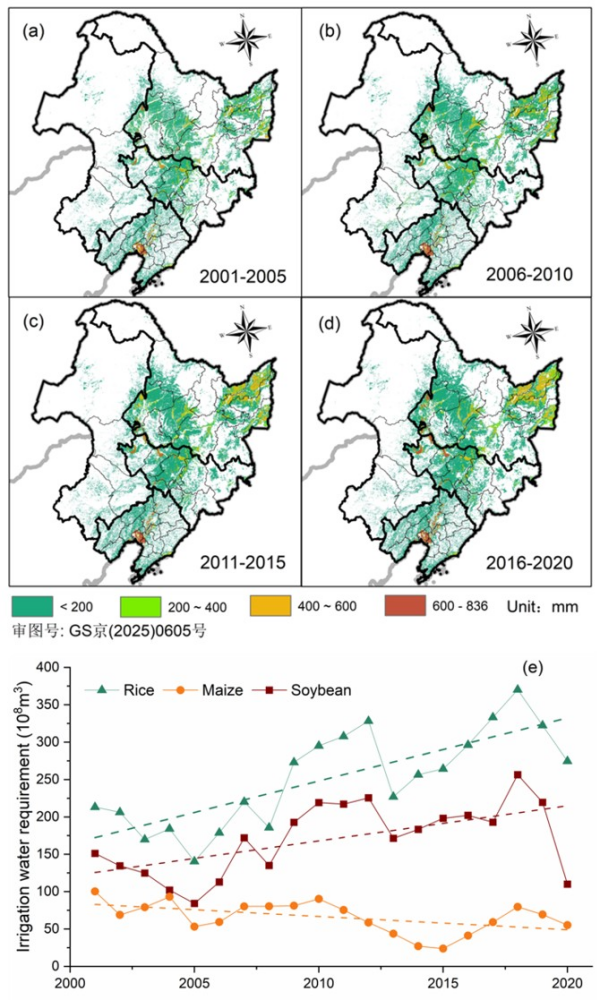 图3 东北黑土区作物灌溉需水量(a)2001-2005年空间分布特征(b)2006-2010年空间分布特征(c)2011-2015年空间分布特征(d)2016-2020年空间分布特征(e)2001-2020年水稻、玉米、大豆灌溉需水量年际变化特征