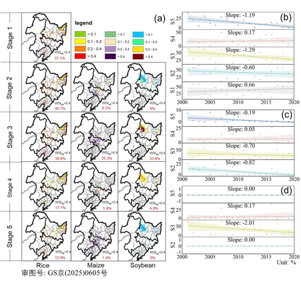 图 4 (a)水稻、玉米、大豆不同生育期农业水资源短缺指数(WSIag)的平均值,(b)~(d) 2001-2020 年水稻、玉米、大豆不同生育期农业水资源短缺指数变化特征。(注释:第 1 阶段:泡田期,第 2 阶段:初始生育期,第 3 阶段:快速发育期,第 4 阶段:生育中期,第 5 阶段:成熟期)