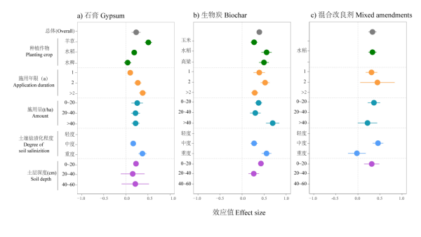 研究发现,不同类型改良剂的改良效果存在显著差异(p < 0.05),石膏类改良剂、生物炭和混合改良剂施用后土壤碱度分别降低21.5%、19.6%和37.0%;生物炭对土壤养分含量提升效果最佳(47.8%),石膏类改良剂相对最低(26.4%)。三种改良剂多用于中、重度苏打盐碱土表层(0~20 cm)土壤改良,其施用量和施用年限对土壤改良效果存在差异。改良剂施用量是影响石膏类改良剂、生物炭和混合改良剂等降低土壤碱化度和盐分效果的主要因素。石膏类改良剂主要作用原理是降低土壤碱度,进而间接提升土壤养分和促进作物生长,生物炭和混合改良剂兼具降低土壤碱度和直接提供土壤养分的作用。土壤改良剂在选择使用上不仅要考虑用量,种植作物类型、改良剂成本、作用效果持久性以及环境安全性问题也是重要的参考因素。这些研究结果为苏打盐碱地改良剂的科学选择提供了理论依据。