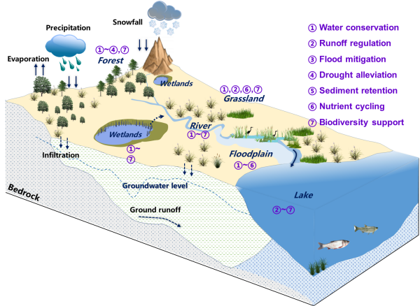 在全球气候变化与人类活动的影响下,湿地作为地球生态系统的关键节点,其水文多功能性在全球生态与水资源管理领域备受瞩目(图1)。湿地不仅是生物多样性的庇护所,更是水循环的重要调节器,具备调节径流、缓解洪水、维持低流量、促进地下水补给以及支持生物多样性等多种水文功能。然而,当前研究多聚焦于湿地的单一水文功能,对于湿地综合水文功能的协同作用与整体贡献尚缺乏系统性认识,这限制了湿地在流域水资源管理与生态保护中潜力的充分挖掘。如何从流域尺度量化湿地的水文多功能性,成为国际生态水文学领域的前沿科学问题