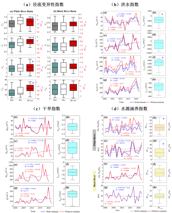 近日,东北地理研究所水文与水资源学科组科研人员联合西南林业大学和加拿大国立科学研究院提出了流域湿地水文多功能性定量评估框架,利用耦合湿地模块(包括河滨湿地和孤立湿地模块)和寒区水文过程(冻土冻融、积雪融化)的半分布式水文模型平台(PHYSITEL/HYDROTEL),动态模拟流域水文过程,引入径流变异性、洪水强度、干旱强度和水资源涵养能力等水文指标构建了湿地水文多功能性定量评估体系,并以青藏高原黄河源区的黑河与白河流域为研究区,量化评估了流域湿地水文多功能性。结果显示,湿地通过减少不均匀分布系数、完全调整系数、集中度和变化幅度来降低径流变异性。湿地可以有效缓解洪水风险,降低峰值流量,同时提高枯季低流量和基流量。此外,湿地还增强了流域的水资源储存与涵养能力,对黑河和白河流域蓄水能力的提升作用分别达到30.6%和19.8%。湿地水文多功能性显著提升了黑河和白河流域应对水文极端事件的韧性(图2)。