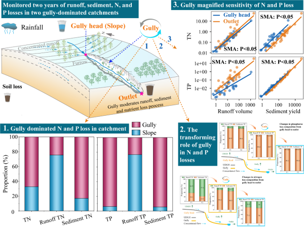 近日,东北地理所黑土退化与修复学科组郭明明研究团队在降雨下沟道调控东北黑土区农业集水区径流、泥沙、氮和磷的流失模式取得进展。该项研究以东北黑土区2条侵蚀沟所在集水区为研究对象,对2022、2023年所有次降雨过程中入沟和出流域的径流、泥沙、氮和磷流失过程进行了原位监测。结果表明:集水区63.9%的径流源自坡面,而沟道贡献了集水区95.1%的土壤流失量;在总氮和总磷流失中,沟道的作用也显著大于坡面,分别贡献了集水区总氮和总磷流失总量的71.6%和94.8%。径流与泥沙来源的空间异质性显著改变了氮磷流失形态,从坡面到沟道,总氮流失的主导形态从径流总氮转变为泥沙总氮,同时进一步提高了集水区内泥沙总磷流失的占比(>90%)。总氮和总磷流失对土壤流失过程的敏感性均显著高于径流过程(图1)。这表明,在以沟道为主导的集水区中,控制土壤流失比减少径流更能有效缓解农田氮、磷的流失,因此调流控蚀应作为农业集水区氮磷管理的优先策略。研究结果可为沟道主导型农业集水区的侵蚀防治和面源污染治理提供科学依据。