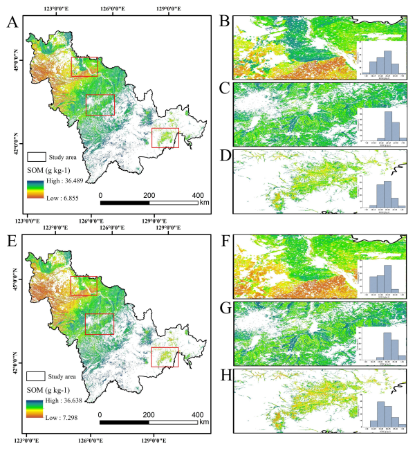 图2. 吉林省土壤有机质(SOM)空间分布全局与局部回归模型预测结果比较。A:全局回归模型预测的SOM空间分布图。B~D:A图中选取的典型区域。E:局部回归模型预测的SOM空间分布图。F~H:E图中选取的典型区域。B~D和F~H图中的条形图分别表示各区域内不同SOM含量的比例