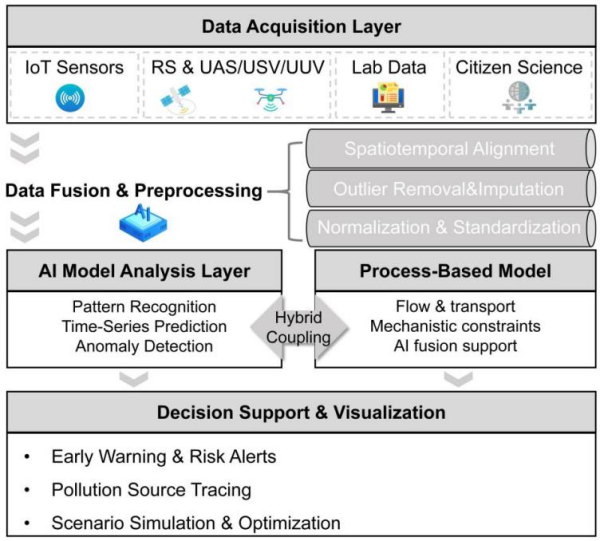 在全球城市化加速与气候变化叠加影响下,水污染问题日趋严峻,传统水质监测手段因响应滞后、覆盖范围有限和应对突发事件能力不足,已难以满足当前水环境治理需求。人工智能(AI)技术的快速发展为解决这一问题提供了新路径。中国科学院东北地理与农业生态研究所水环境健康与模拟学科组在综述性研究中提出,通过整合AI与物联网(IoT)、遥感(RS)及无人监测平台(UMP)等技术,构建混合建模框架,有助于提升实时水质监测精度与效率,拓展数据获取范围,并实现多源异构数据的融合与智能分析。