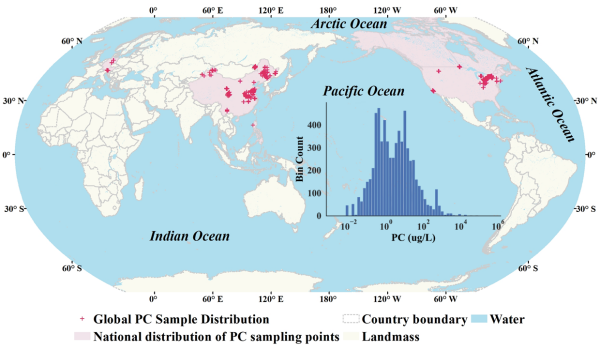 图1 全球藻蓝蛋白(PC)样点(图中红色+)和频率分布(直方图)