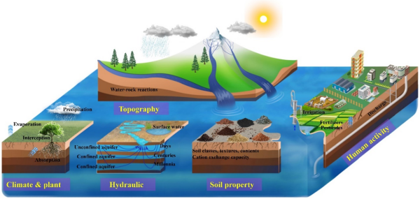 图1 地下水溶质动态示意图,展示了自然过程(如气候、土壤性质、植物吸收和地下水-地表水相互作用)与人为干扰(如城市化、农业、废物处置)之间的水力联系与相互作用,以及它们对地下水系统的综合影响。