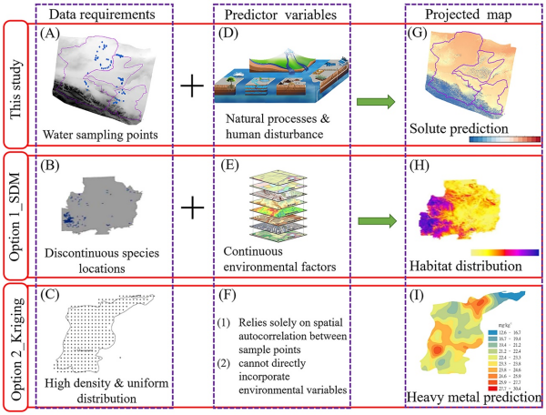 该研究系统采集了浅层地下水、深层地下水和地表水样本,建立了包含地形、气候、水力联系、土壤特性和人类活动等五大类环境因子的多维数据库。创新性地将溶质浓度类比为生态系统中的物种"适生性",利用SDM模型模拟其在地下水系统中的空间分布规律。通过引入端元混合分析(EMMA)、随机森林和AICc模型选择等先进算法,有效解决了野外观测数据不足的难题,预测精度较传统空间插值方法(如克里金法)提升30%以上。