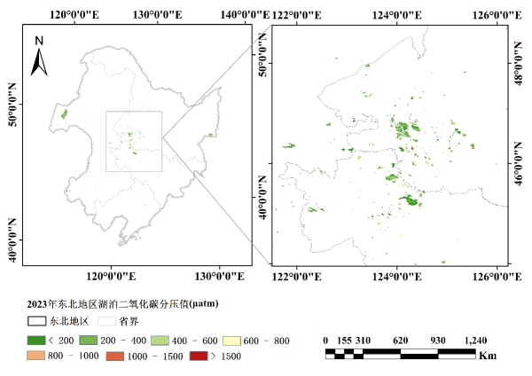 中国科学院东北地理与农业生态研究所水环境遥感学科组的研究人员,对东北地区不同季节湖泊表层水体二氧化碳分压(pCO2)进行了多次实测与分析,并基于Landsat卫星影像,构建了适用于东北湖泊表层水体pCO2的XGBoost模型(拟合精度R²=0.86,RMSE=148.73 μatm;验证精度R²=0.71,RMSE=186.14 μatm),并将该模型应用于湖泊表层水体pCO2反演(图1),结果表明,自1985——2023年,东北地区湖泊pCO2年均值处于下降趋势;基于pCO2遥感反演结果和气象等数据,估算1985年、2010年和2020年东北地区湖泊(面积>1km2)水-气界面CO2年排放通量分别为1.74 Tg、1.19 Tg和0.62 Tg,到2023年已为负值,东北地区湖泊正在经历由潜在的大气CO2碳源向碳汇转变的过程;研究推测湖泊营养程度的变化可能是导致东北湖泊水-气界面CO2年排放通量变化的一个主要原因。本研究对深入理解湖泊在全球气候变化过程中的作用具有重要意义。