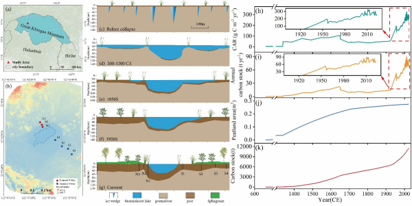 为了明确多年冻土区热融湖畔泥炭地碳库的形成过程及碳累积过程。湿地演化与生态功能学科组的研究人员以位于全球中高纬度多年冻土区最南缘的大兴安岭北部(图强)地区中典型热融湖畔泥炭地为研究对象,通过野外样带调查和多钻孔泥炭沉积记录分析发现,干旱事件和局部地貌对热融湖畔泥炭地的湖向扩张进程产生重要影响,扩张速率介于2 cm yr-1 ~ 32 cm yr-1;受水位下降和气候变暖的双重影响,自1950s起热融湖畔泥炭地由形成初期的缓慢碳累积阶段转变为快速碳累积阶段,碳累积速率从45.2±5.5 g C m-2 yr-1增至 330.5±14.4 g C m-2 yr-1;泥炭地面积扩张与快速碳累积速率共同促进了热融湖畔泥炭地总碳储量的显著增加,在公元1700年以前,泥炭地形成初期的面积增加是导致泥炭地碳库储量增加的最主要因素,而自1950s以来,快速碳累积速率是导致泥炭地碳储量增加的最主要因素,并促使所研究的泥炭地累积了近总碳储量(1.14×104吨)三分之一的碳;此外,随着热融湖畔泥炭地进入快速碳累积阶段,泥炭中化学性质较为稳定的芳香类化合物的比例从 29.3% 增至 32.3%,表明近年来热融湖畔泥炭地土壤碳库的化学稳定性也有所提高。