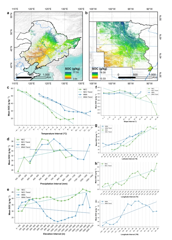 土壤有机碳(Soil Organic Carbon,SOC)在全球碳循环中发挥着关键作用,是全球最大的陆地有机碳库。然而,关于中国东北黑土区(NEC)和北美密西西比河流域黑土区(MNA)SOC含量的空间分布格局及其与环境因子(气候、地形等)的关系仍不清晰,制约了跨区域碳管理与精准保护的科学支撑。
